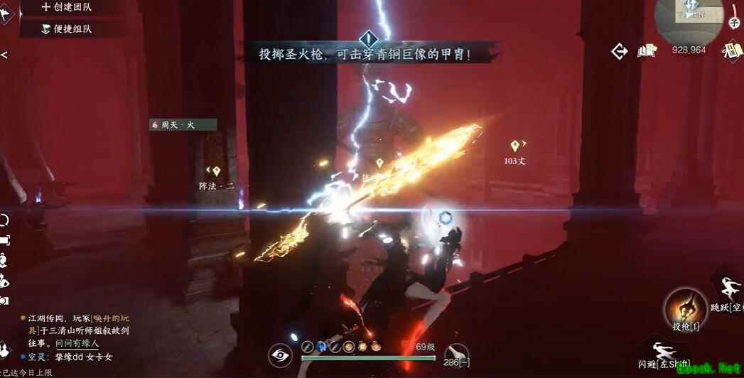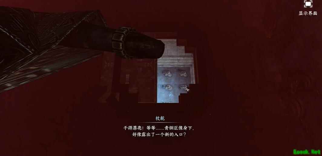 3、来到坐标(910,1002)处进入室内,阅读线索后来到外面投掷圣火枪击穿青铜巨像的甲胄。