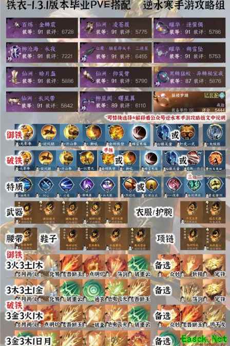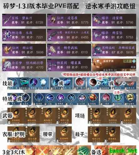 《逆水寒手游》1.3.1全职业PVE毕业配装分享1、搭配前言 1)破防流搭配秒伤上限高下限低,对内功和装备的要求比较高,不适合大多数玩家。且未来开荒英雄本BOSS防御还会增加,就不做统一推荐了。 2)目前装备的防具毕业套为三连星手+百炼四件套+柳沧海衣服和三独珍(三连星,鳞骨护腕,余若梦)+百炼两件套+柳沧海衣服。一般来讲进本后更推荐三连星手+四件套的搭配,打桩或者命中会心不足时可以尝试三独珍的搭配。 过渡搭配为三连星+鳞骨护腕+剑梦鞋子+两件套+柳沧海衣服;余若梦腰带+四件套+柳沧海/李白衣服(240身法)。 2、碎梦