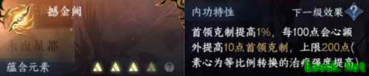 2、内功【撼金阙】(下周可获取) 满级效果:首领克制提高2%,每100点会心额外提高20点首领克制,上限400点(素心为等比例转换的治疗强度提高)。 效果分析:4金1随机,2000会心即可吃满400点首领克制收益,内功总收益在4%附近,比现阶段的鸣干戈/破釜特性收益高一些。