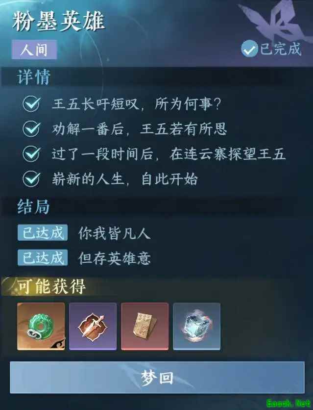 2、对话选择“连云寨里...”,之后到连云寨1050.972处对话王五即可达成《结局·你我皆凡人》: