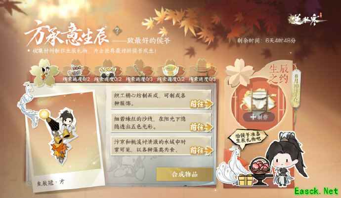 二、生辰送礼任务 1、需要前往汴京找到唐铸,通过对话选择取鎏金箭矢获得生日礼物鎏金箭矢。 2、在8月10日当天赠送给方承意,可以激活特别任务并触发精彩生辰奇遇剧情,完成奇遇可以获得精美背挂【枫叶心灯】等奖励。