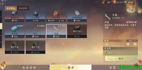 《逆水寒手游》方承意生辰礼活动第六日攻略:一、生辰礼物合成 1、前往商城,点击集市。 2、前往江湖身份,再点击身份商品,使用5000交子购买生筋。