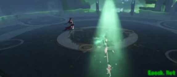 三、摆荡技能 1、墨荷释放摆荡技能后,会在场上留下残丝虚影,同时重复释放该技能。 2、玩家只需要注意引导墨荷摆荡的方向,并躲避地上的范围伤害即可。
