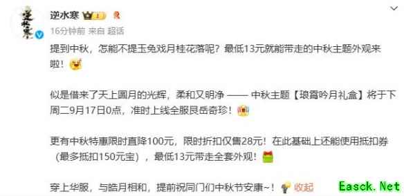 《逆水寒手游》中秋外观琅霄吟月一览:1、中秋主题【琅霄吟月礼盒】将在2024年9月17日0点准时上线;