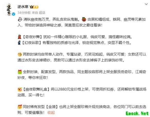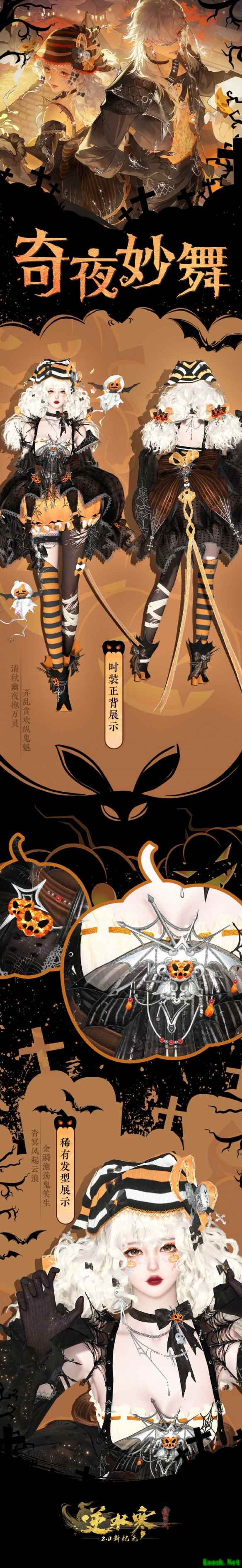 《逆水寒手游》奇夜妙舞幻夜纵歌时装外观一览:上线时间 2024年10月31日 外观展示 1、女号