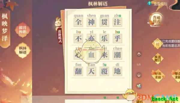 界面趣味玩法-枫林解语 1、开启时间:11月14日。 2、参与枫林解语,成为江湖猜词达人,活动期间,普通和挑战模式在次日0点解锁新的成语题目。