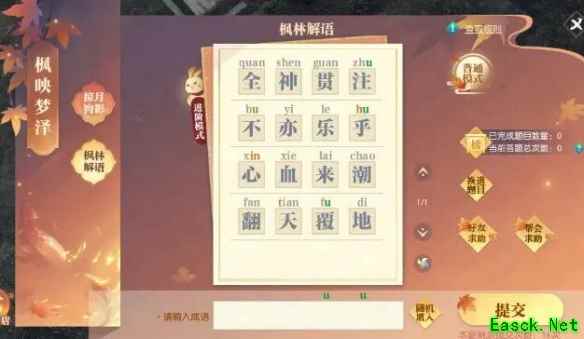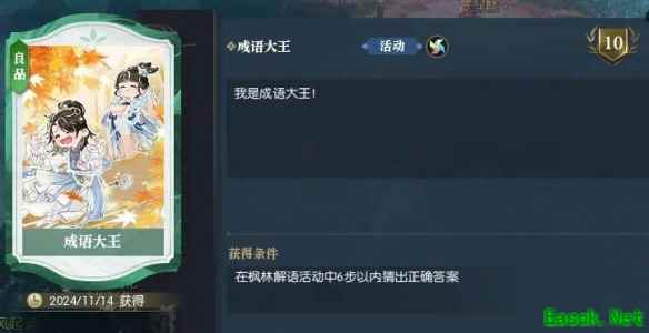 《逆水寒手游》说英雄卡成语大王获取攻略:1、11月27日24时前去参与【枫林解语】活动; 2、有普通和挑战模式两种,玩家选择哪一种都行,普通更简单;