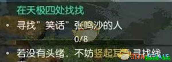 2、根据指引前往天极的指定坐标点位【1772.228】,和张鸣沙对话即可接取城中笑谈任务。 3、之后就需要再天极四处找到八个笑话张鸣沙的人,按数字键1可能竖起耳朵查看并倾听周围的对话声。