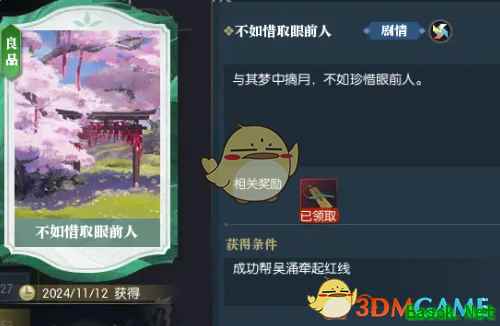 4、达成心想事成逸闻任务后可获取到说英雄卡【不如惜取眼前人】奖励。
