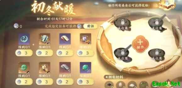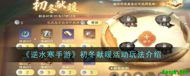 逆水寒手游初冬献暖活动怎么玩一、玩法介绍 1、在冬至活动初冬献暖开放期间,参与登录、完成日课点,获取风云今均可获得特殊积分“暖冬币”和美食制作材料。 2、集齐所有美食可获得额外奖励,期间可通过好友赠送获得美食制作材料。