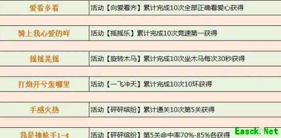 7、爱看多看:【向爱看齐】累计完成10次全部正确看爱心 8、骑上我心爱的咩:【摇摇乐】累计完成10次竞速第一 9、摇摇晃摇:【旋转木马】累计完成10次坐木马每次30秒 10、打炮开兮轰哪里:【一飞冲天】累计完成10次10环 11、手感火热:【砰砰缤纷】累计通关10次第5关 12、我是神枪手1-4:【砰砰缤纷】第5关命中率70%6-85% 13、你人怪好嘞:拿到百射百中、摇摇乐见、小熊蹦高、向球看、惊喜礼盒、乐于助人