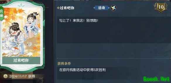 3、在枫映梦泽【掠月钩影】活动中获得3次胜利即可获得说英雄卡【过来吧你】;
