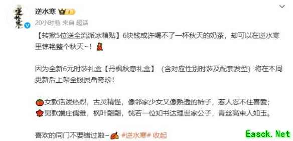 详细介绍 1、【丹枫秋意礼盒】将在2024年11月28日更新后上线全服艮岳奇珍; 2、时装售价6元,购买后可获得对应性别时装及配套发型。
