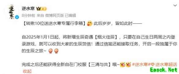 《逆水寒手游》三清与共时装获得方法:2025年1月1日后完成自己的生日任务 详细介绍 1、时装将在2025年1月1日上线,更新后将新增生辰奇遇【烟火佳辰】; 2、玩家需要设置自己的生日并在生日两周之内登录游戏;