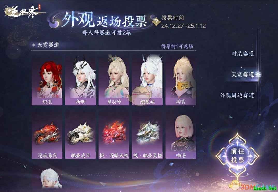 大客户们呼声超高的逆水寒手游外观返场投票终于来啦 明天新版本更新后,游戏内将分【时装】【天赏】【外观周边】三大赛道开启返场投票