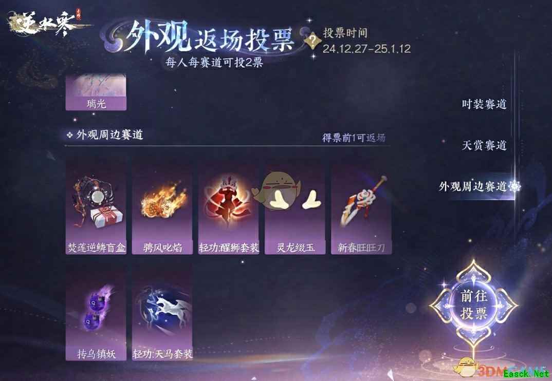 投票返场规则: 每位玩家在每个赛道拥有2票,同一外观仅能投1票 时装赛道票数最高的2个外观,天赏/外观周边赛道票数最高的1个外观将在2025年1月17日版本更新后重新上架 下架超过6个月的非联动限时外观,才会进入返场投票;返场直售两次后的限时外观,将不再进行直售返场