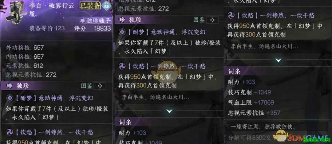 3、南问雪项链:123装等独珍项链,提供500首克+300元素攻,可替换目前英雄山海项链。 4、李白鞋子:950点首克,幻梦再提高300点。