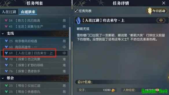 《逆水寒手游》归去来兮上任务攻略:1、首先打开任务列表【山雨欲来】找到【归去来兮·上】并接取;