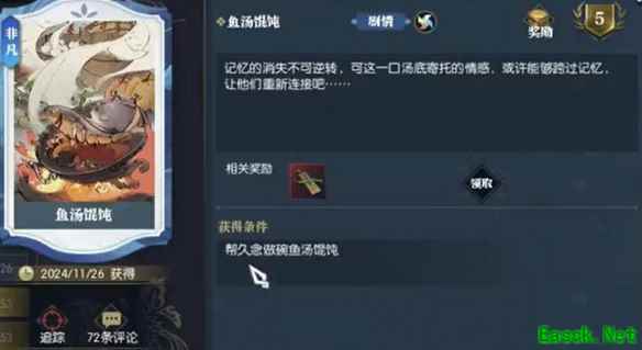 4、最后出副本和【彩娟】对话完成任务获得说英雄卡【鱼汤馄饨】。
