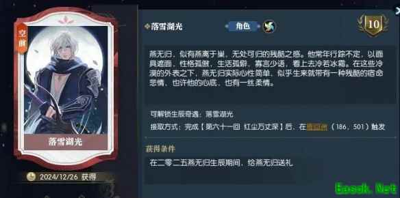 《逆水寒手游》落雪湖光奇遇攻略:1、先完成主线【第六十一回 红坐万丈深】然后去给【燕无归】送礼物触发;