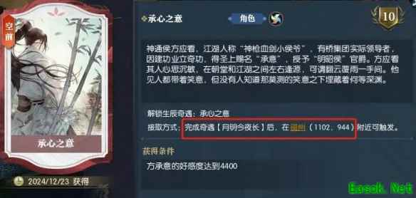 《逆水寒手游》承心之意奇遇攻略:1、方承意好感到4400触发卡片然后去磁州(1102.944)接任务;