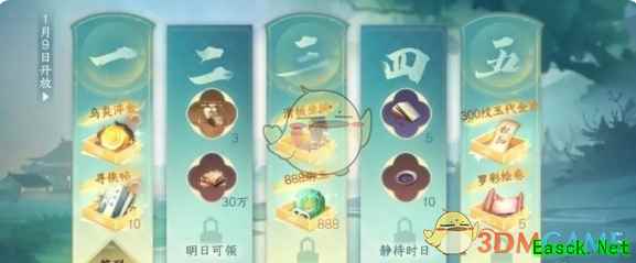 2. 其他新春福利 1、1月9日:登录游戏可领取乌炎淬金*1、寻侠帖*10。 2、1月10日:登录游戏可领取优稀有内功宝箱、30W交子。 3、1月11日:登录游戏可领取滑板坐骑、888绑玉。 4、1月12日:登录游戏可领取5玉华染、10轻容染。 5、1月13日:登录游戏可领取300纹玉代金券、罗彩绘卷*5。