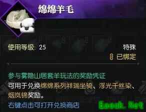绵羊毛毛可用来兑换坐骑,很多玩家都想知道绵羊毛毛怎么获得,进入雾隐山居(570.685),对话【杨绵绵】选择【套羊】开始套羊游戏套中即可获得【绵绵羊毛】,接下来就由小编给大家带来了详细的《逆水寒手游》绵羊毛毛获得方法!
