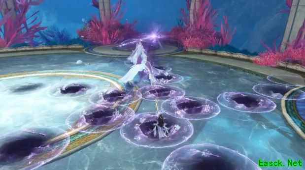 这时,你的任务就变得异常艰难:要阻止心渊中的浊影和游魂侵蚀流珠。每当你击败一个心渊浊影,海底世界中便会显现出流珠遗念。玩家要做的就是,治愈这个遗念,恢复其中的能量。这不仅能够为你提供强大的保护,还能打造出减伤的领域,让你在面对夜珑的致命“哀鲛恨歌”时,能够免受大部分伤害。这里的节奏掌握得非常关键,既要打击敌人,又要保护流珠,不能一味攻击而忽视防守。另外,流珠还会指引你拾取海螺,完成旋律的任务,打断夜珑的进攻。成功打断她的攻击,能够为你争取更多时间,也为接下来的挑战积攒优势。