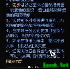 3、进入牢房对话【守卫】,需要鞭打密探来提高屈服度,屈服度200即可完成小游戏;