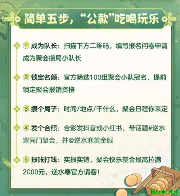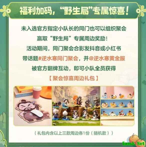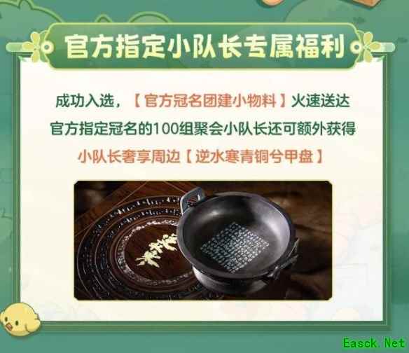 3、参与活动后需要在抖音、小红书平台发布关于本次聚会的合影,官方会为小组进行报销; 注:成功入选还可额外获得小队长专属周边【逆水寒青铜兮甲盘】
