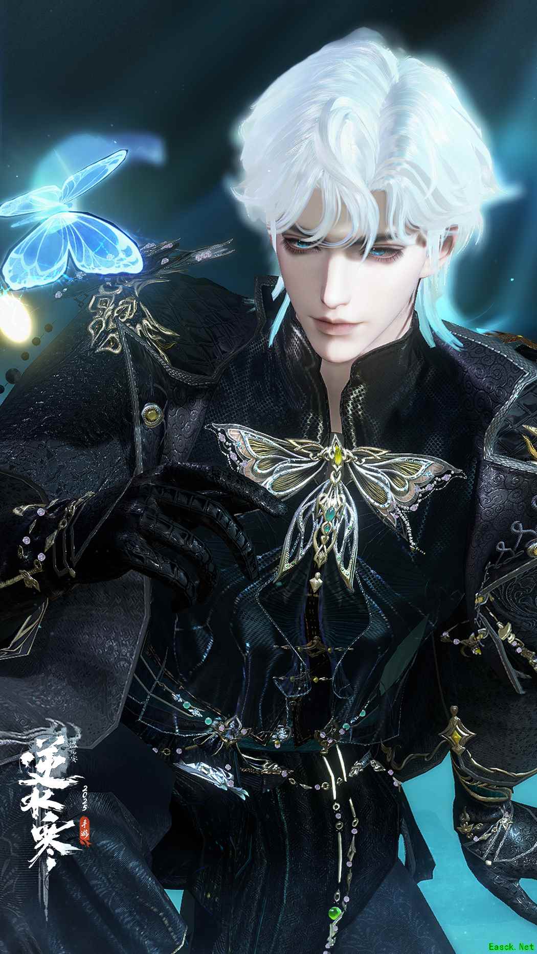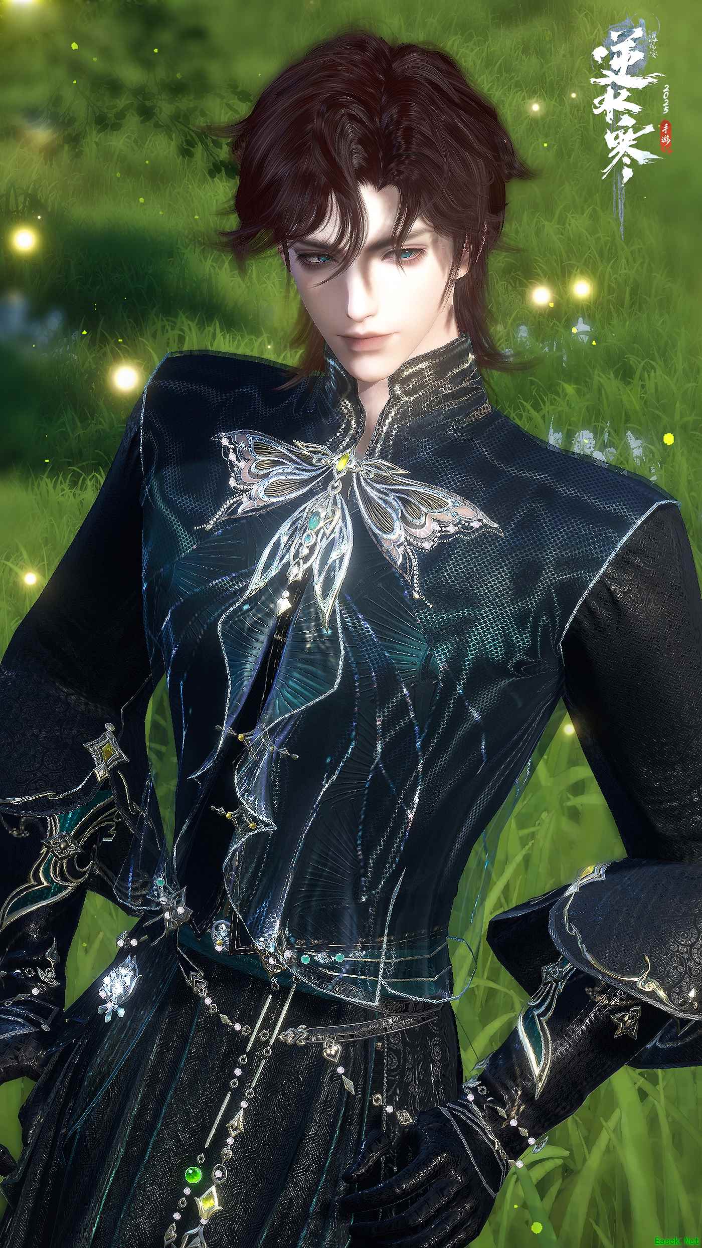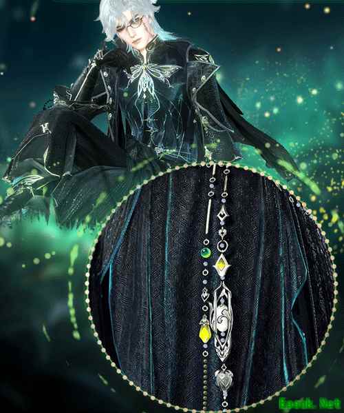 浩瀚无穷的夜色,却被他一肩扛起,披挂在身;纯粹不意味着单调,材质丰富的暗线与点点星芒的纹路相互盘结,正如他心中庞大而复杂的谋划;坚实胸膛上的蝶状纹饰与腰间盘错的珠玉琴瑟和鸣,彰显着没溢出、刚刚好的自信与优雅;细节决定格调,就像他在不经意间流露出的细腻内搭与精巧雕饰。