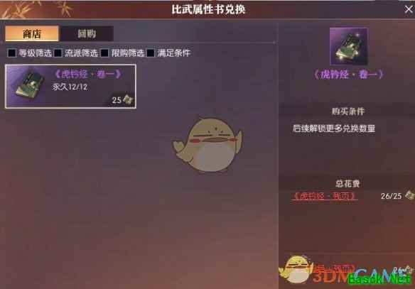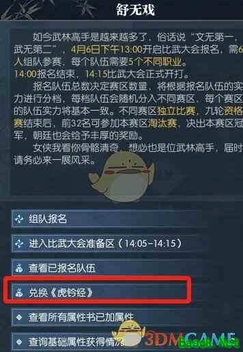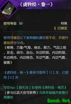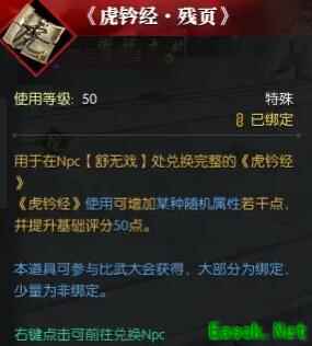 2、再去找NPC【舒无戏】用25张残页来兑换一本完整的《虎钤经》;
