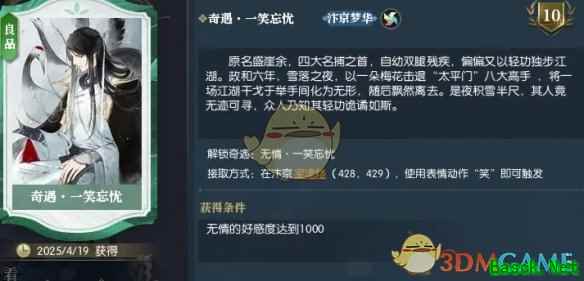 《逆水寒手游》一笑忘忧奇遇攻略1、无情好感1000触发卡片,然后去汴京(428,429);