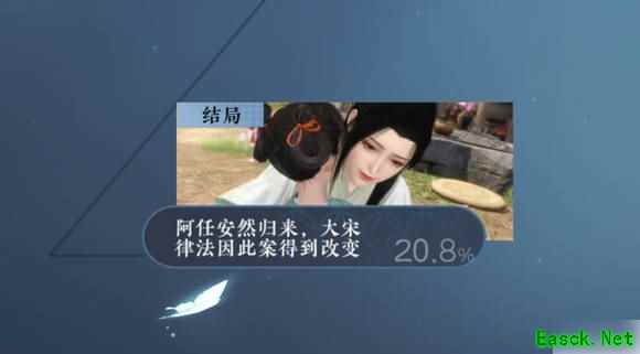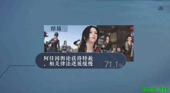 2、结局二 阿任因舆论获得特赦,相关律法进展缓慢。 触发条件1:心境任务【江湖之义】中选择寻求盟主帮助时选择【不能就此放弃】。 触发条件2:心境任务【众生之相】中,在虹桥上与路人对话时,在以下几位愿意前往衙门听审的NPC。至少选择两位:李秋疏(1021.1033),岑婉儿(1019.1044),婷儿(1022.977),赵栖柔(1007.993),林小蝶(1012.1013)。 触发条件3:心境任务【众生之相】中宋赵争论中选择【你俩说的都对】或【赵兄说得有理】或【宋兄说得有理】。 3、结局三 阿任轻判坐牢,相关律法进展缓慢。
