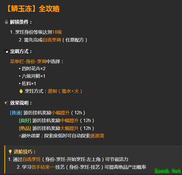 琥珀氽鲜汤配方及材料获取方法 《逆水寒手游》鳞玉冻配方及材料获取方法【鳞玉冻] 解锁条件: 1.烹饪身份等级达到18级 2.需先完成自选烹调(任意配方) 烹调方式: 菜单栏-身份-烹调中选择: 四时花卉x2 六级河鲜x1 佐料x1 烹饪方式:蒸制(需水+火) 效果说明: [普通] 游历挂机奖励小幅提升(12h) [良好] 游历挂机奖励中幅提升(12h) [绝品]游历挂机奖励大幅提升(12h) 额外效果:探索度低时可自动探索逐浪湾 进阶技巧: 1、通过自选烹饪(身份-烹饪-开始烹饪-左上角)可节省活力 2、学习信手拈来一技艺(身份-烹饪-技艺)可提高绝品产出概率