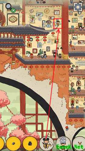 道士位置介绍: 道士在拱门右上角的屋檐上站着的,如下图: