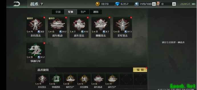 战术系统介绍 游戏中的战术系统是一个辅助系统,可以理解为指挥官的战场技能。目前战术系统共分为军事、生产、通用三大类,每一类的战术都有它独特的受众群体以及特殊的属性加成。指挥官需要通过花费钻石来解锁新的战术,随后使用金币升级战术,战术等级越高,对应的属性加成也就越多。 在实战中,指挥官可最多装备8种完全不同的战术,每使用一次战术将会消耗不同数量的战术点。所以对萌新指挥官而言,认识每种战术的作用以及如何更有效分配战术点是非常重要的一课。 一、军事类战术