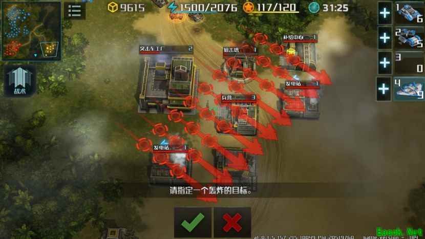 除此,前期以守家为主,由于玩空军飞机玩法,所以防空的建筑是必须建造的,前期三个都要放在距离敌人最近的外侧位置。建造完成后我们可以分批次的用方队试探性进攻,摸清敌人的防守力量和建筑位置。这一波试探必定会遭到敌人的反击,所以我们要做好第一方队全军覆灭的准备。
