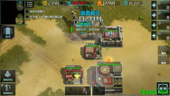 本局通关玩法:前期派遣系统所给的所有兵力前往地图上方占领,后方家中建造突击车工厂和兵营,因为是部署模式所以建造速度很快(最好都升级到二级)。占领后生产兵力全力护送运输车便可成功过关。(注意不要让任何一辆运输车损坏,因此兵力最好都排到运输车前方)