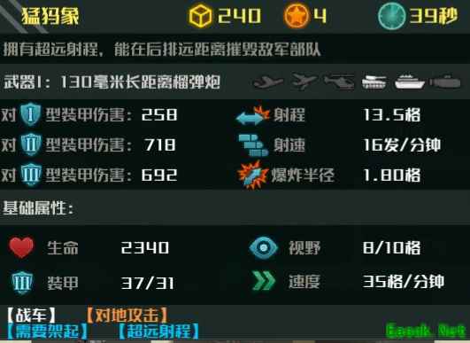 陆空流玩法攻略 反抗军造兵资源少,可以玩起兵流作战 1、陆地流:首先把突击车工厂升到满级造美洲豹(原因如下图,美洲豹随着敌方兵种的升级对甲伤害变高,而且美洲豹是战车的克星,可以抵制战车) 如果对面是飞机流的话,一定要造箭猪,有很好的防空能力,也是空军的克星,可以和美洲豹完美配合攻击如果你要攻家和守家,再加上对面有飞机流和战车同时过来时,建议使用猛犸象、美洲豹、箭猪流(下图可以看出,猛犸象具有较强的防御,还有超远程的攻击,攻家和守家有着重要的用处)