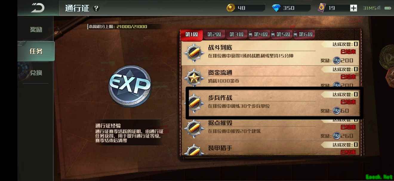 通行证升级方法 其实非常简单,就是完成通行证上的任务。首先先打开通行证,点击任务,看看你处在第几周。 第1周和第3周有步兵和战车生产的任务。这时候反抗军的福利就来了。 开局直接根据任务造所需的步兵或战车。差不多一场下来就能升一级。。但还是需要三周,因为每一周龙胜的战略经验只有二十级。