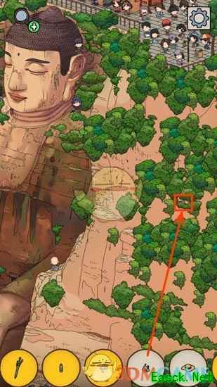 垃圾袋位置介绍: 垃圾袋大佛肩膀右侧的山崖上,在一片茂密的树叶中,可能大家要仔细找才能找到,如下图: