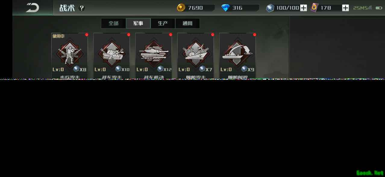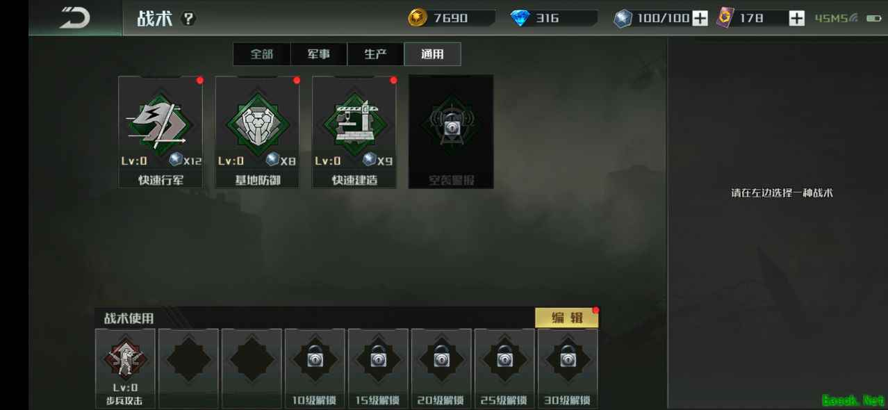 “步兵训练”和三种兵种生产战术提高兵种的训练速度,“紧急措施”战术提供建筑方面的加成,在资源不足时有奇效。 3、通用类