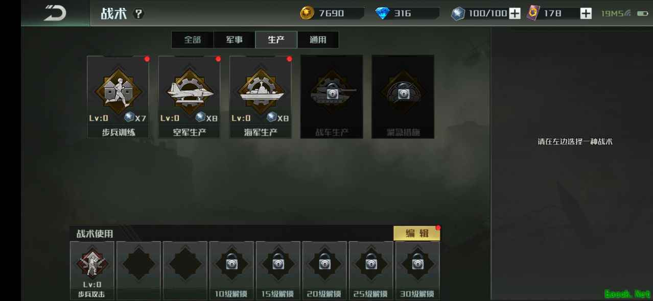 军事类战术总的来说就是提升战斗能力,其中“步兵攻击”、“战车攻击”、“舰船攻击”、“空军攻击”和“全军攻击”这五种战术直接提升单位的伤害。而“战车机动”提升战车移动速度,“舰船射程”增加舰船攻击范围。 2、生产类