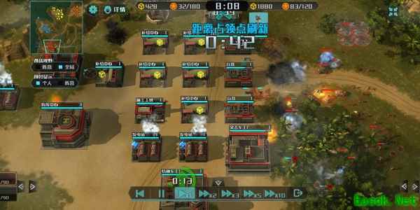五、战略防御 在中期的时候,对手向我方基地发动了进攻。对面的部队是有大量的小兵和战车组成。此时我们利用前期建造的狙击塔,对他们的小兵造成极大的伤害,同时也要生产一些小兵来阻止对面的进攻。若选择防守策略,我们可以选择合适的改造单位来帮助我们更好的进行防守布局。这里推荐的改造是刺刀,在敌方进攻时可以建造三个兵营,全力制造刺刀,甚至可以不计成本不计数量,大量的刺刀可以形成前排肉盾,我们仔细看还可以看到对面还出了直升机这些空中力量,针对空中力量,我们可以出一些箭猪,记得要把防空的箭猪放在后排,前排有小兵和战车组成一道防线,就像一面墙一样把对面的单位挡在基地之外。