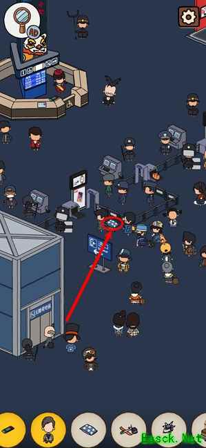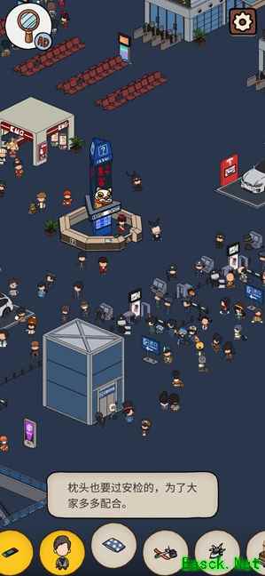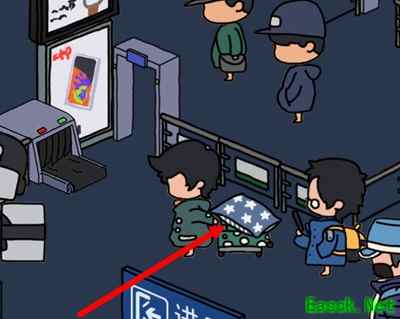 3、枕头在地图右侧的安检口,一个男性正拖着行李,行李上就放着一个枕头准备过安检。