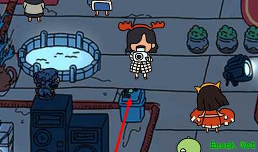 2、荧光玉佩在地图中左下方的一个蓝色的垃圾桶上,正对的是一个拿着相机的女孩。