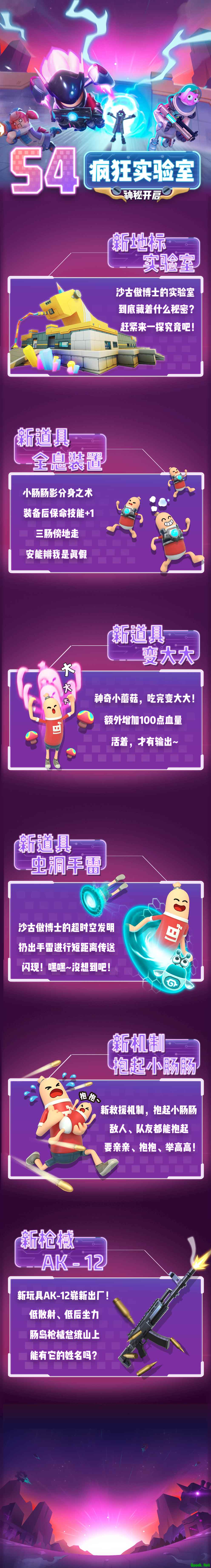 《香肠派对》中的沙古傲博士发现了彩虹矿脉之后,在肠岛继续进行着他的“天才创造”,造出了有不少好玩的东西。全新“道具与武器”登场,对于不了解的小伙伴,具体内容就来看看下面的介绍吧。 S4疯狂实验室版本全新内容一览