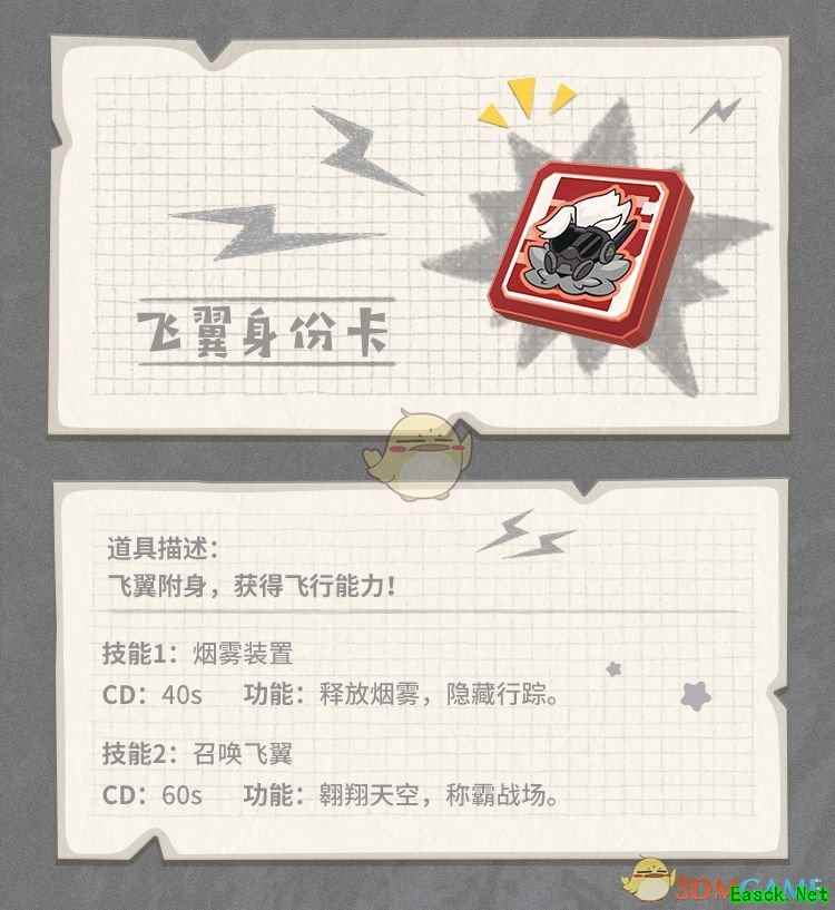 身份卡效果 玩家使用之后,身体背后会长出飞翼,获得飞行能力! 技能介绍: 技能1:烟雾装置 CD:40s 功能:释放烟雾,隐藏行踪。 技能2:超级滚滚 CD:60s 功能:翱翔天空,称霸战场。 以上就是小编整理的关于《香肠派对》飞翼身份卡技能一览的全部内容,更多游戏攻略请持续关注手游网! 本文内容来源于互联网,如有侵权请联系删除。 |