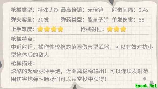 枪械类型:特殊武器 最高倍镜:无倍镜 射击间隔:0.4s 弹夹容量:20发 弹药类型:能量子弹 单发伤害:68 获取方式:空投